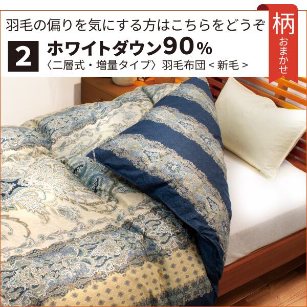 【2】ホワイトダウン90%<二層式・増量タイプ>羽毛布団:シングル・ダブル<柄おまかせ>